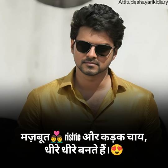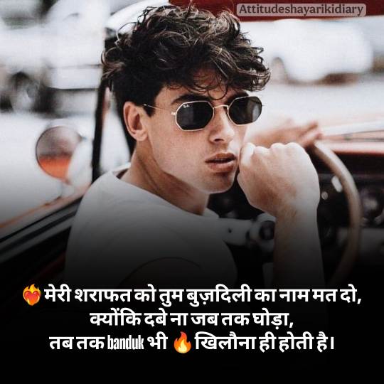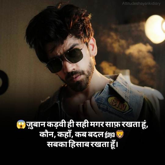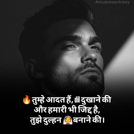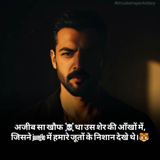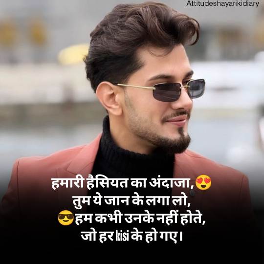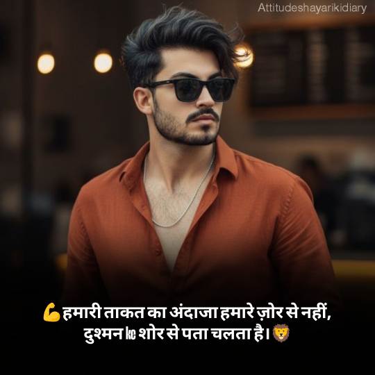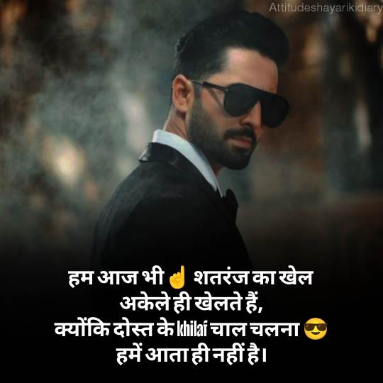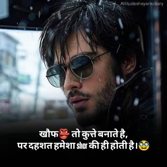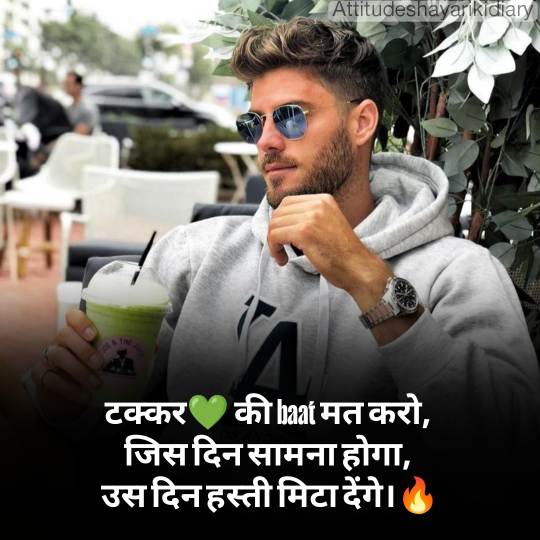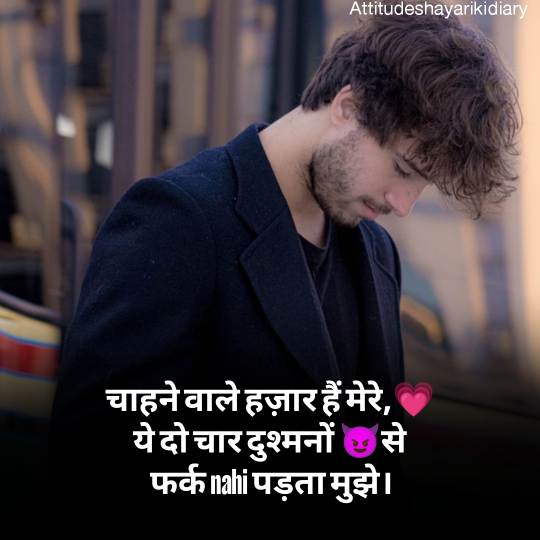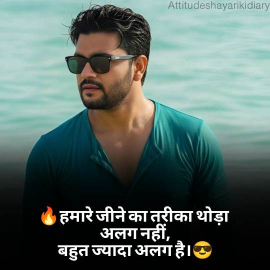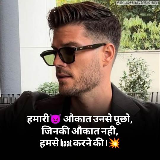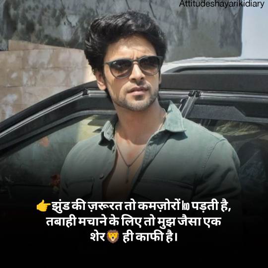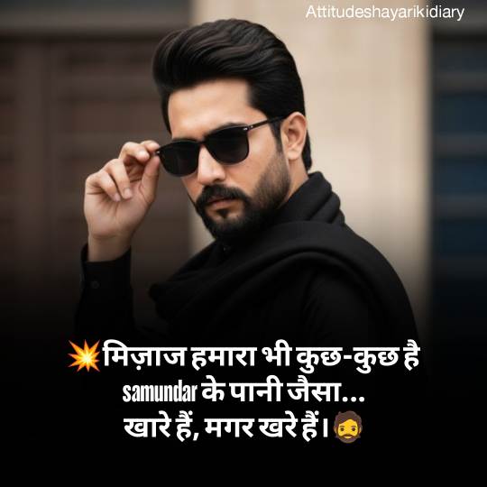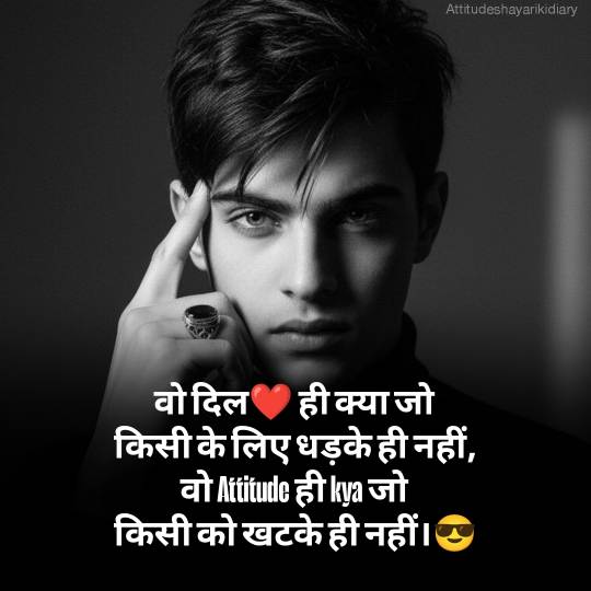 मित्रों हमने यहां पर कुछ दबंग एटीट्यूड वाले लड़कों के लिए Best Attitude Shayari In Hindi सांझा की है। यहां पर आपको दबंग अंदाज में एटीट्यूड शायरी हिंदी में मिलेंगी जो आपका दबंग एटीट्यूड को सबसे ज्यादा सूट करेंगी। आजकल हर कोई इंस्टाग्राम फेसबुक जैसे सोशल मीडिया पर अपने एटीट्यूड का जलवा बिछाना चाहते हैं पर उन्हें उनके एटीट्यूड के लेवल की Boy Attitude Shayari in Hindi नहीं मिलती। अगर आप अपने दमदार एटीट्यूड के लिए Khatarnak Attitude Shayari ढूंढ रहे हैं तो आपकी तलाश इस पोस्ट से पुरी हो जाएंगी। क्योंकि हमने इस पोस्ट में वह सभी New Attitude Shayari दी है जो आपकी अगली पोस्ट के लिए बराबर सूट करेंगी। आप इस पोस्ट को पढ़कर यहां से एक जबरदस्त एटीट्यूड शायरी को अपने अगली इंस्टाग्राम पोस्ट के लिए चुन सकते हैं। और अपने एटीट्यूड का जलवा बिखेर सकते हैं।