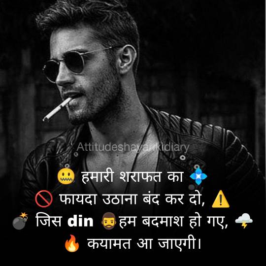 मित्रों मैं यहां पर आपके लिए (😎मेरा 😚style 💚और #✴attitude🔗 #🔥 💙ही #💜कुछ अलग है💋 ✊बराबरी 😈करने जाओगे 👊# #💕तो 👌बरबाद हो ✴जाओगे# 🔫) जैसी दमदार Khatarnak Attitude Shayari का बेस्ट कलेक्शन साझा कर रहा हूं। मैंने आज कि इस पोस्ट में वो सभी शायरियां दी है जिसे आप ढूंढ रहे हैं, Khatarnak Shayari Attitude 🔥, Attitude Shayari 😎😎😎 Boy, Mera Style aur Mera Attitude Shayari with Emoji, Stylish Attitude Shayari In Hindi, Attitude Shayari🔥 Copy, यह सभी शायरी मैंने यहां पर दी है, इन शायरियों में स्टाइल के साथ दबंग एटीट्यूड भी छलकता है। अगर आप अपने इंस्टाग्राम पोस्ट या कैप्शन के लिए दमदार एटीट्यूड शायरी की तलाश में है तो आपके यहां पर आपकी दमदार एटीट्यूड शायरी मिल जाएंगी जिसे आप कॉपी करके अपने इंस्टाग्राम पोस्ट या कैप्शन में लगा सकते हैं।